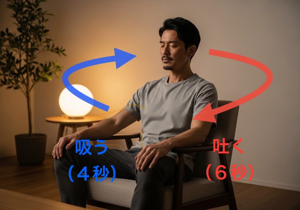 - 呼吸を見直すだけで、体と心は整います。4秒吸って6秒吐く呼吸を5セット繰り返しましょう。副交感神経が優位になり、体の緊張がほどけ、疲労感が軽減します。