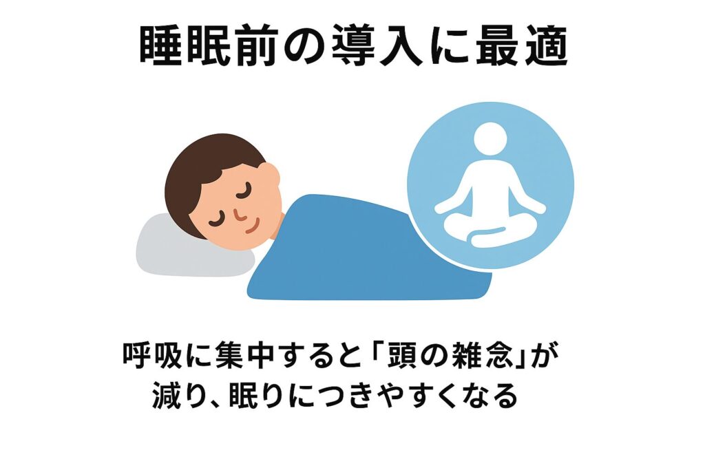 呼吸に集中することで頭の雑念が少なくなり、寝つきが良くなります。布団に入ってから数分実践するだけで効果を感じる人が多いです。
