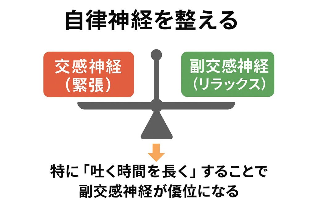 自律神経は交感神経(緊張)と副交感神経(リラックス)でバランスを取っています。吐く時間を長くすることで副交感神経が優位になり、体が落ち着きます。