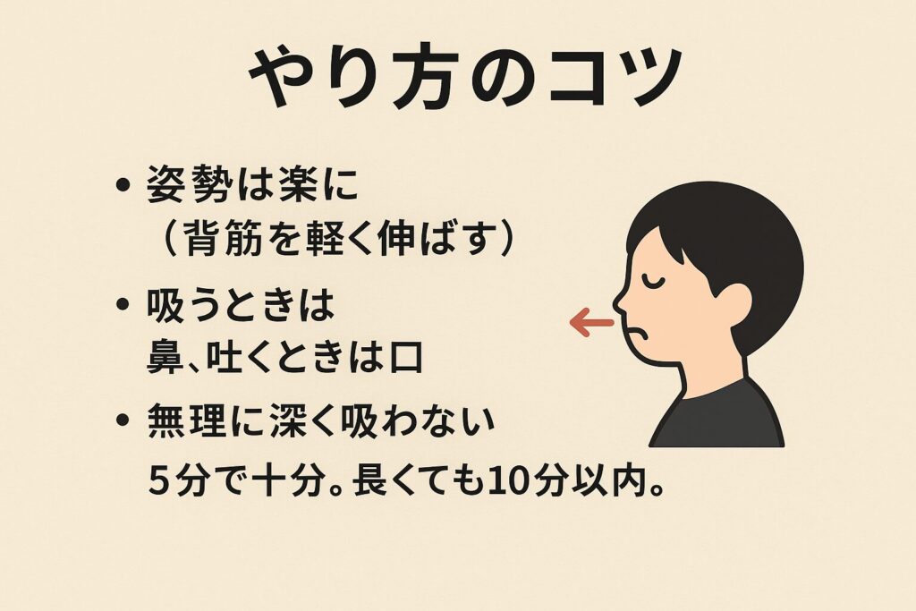 - 吸うは鼻、吐くは口がやりやすい(ただし、口で吐くのが苦手なら鼻でも可)。