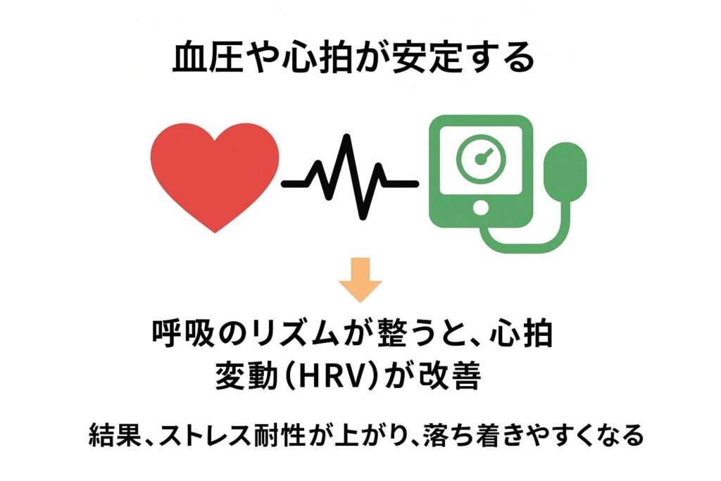 呼吸リズムが整うと心拍変動(HRV)が改善し、血圧や心拍の安定につながります。結果としてストレス耐性が上がり、冷静さを保ちやすくなります。