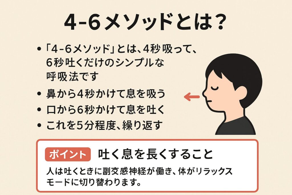 「4-6メソッド」はその名の通り、4秒かけて吸って、6秒かけて吐くだけの呼吸法です。簡単にできて、場所を選ばずすぐ取り入れられます。