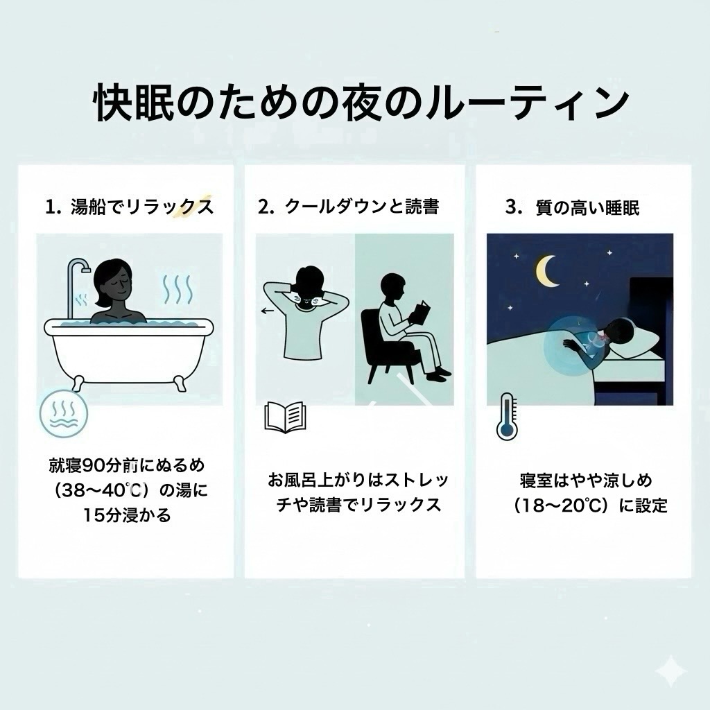 深い睡眠(ノンレム睡眠)に入るためには、**深部体温の急激な降下**が鍵となります。入浴で一時的に体温を上げ、その反動で体温が下がるタイミングと入眠を合わせるのが「体温戦略」です。