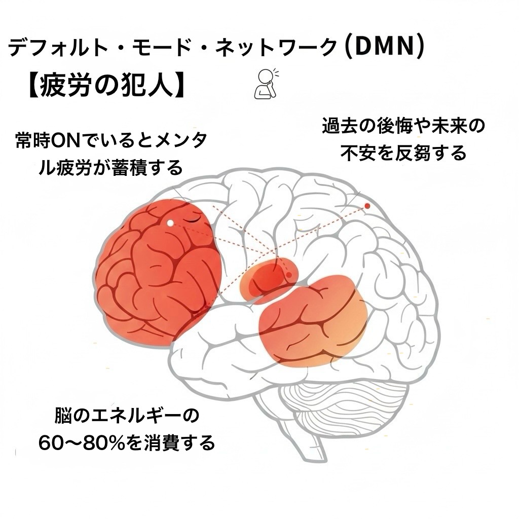 ぼくたちの脳には、何もしていない時に常時働いている「DMN(デフォルト・モード・ネットワーク)」という部分があります。これは過去の後悔や未来の不安を反芻し、脳のエネルギーの約60〜80%を消費する「待機電力」のようなものです。
