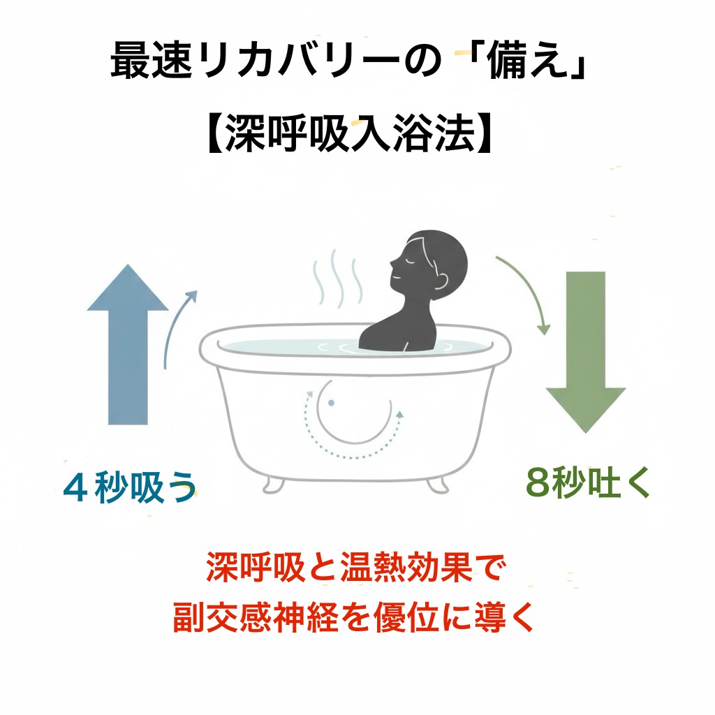 湯船にゆっくり浸かりながら、4秒かけて鼻から吸い、8秒かけて口からゆっくり吐く呼吸を繰り返してください。この「4-8呼吸」は、心拍数を確実に下げ、極限の緊張状態から心身をリセットするために、体のプロとしてぼくが実践している技術です。